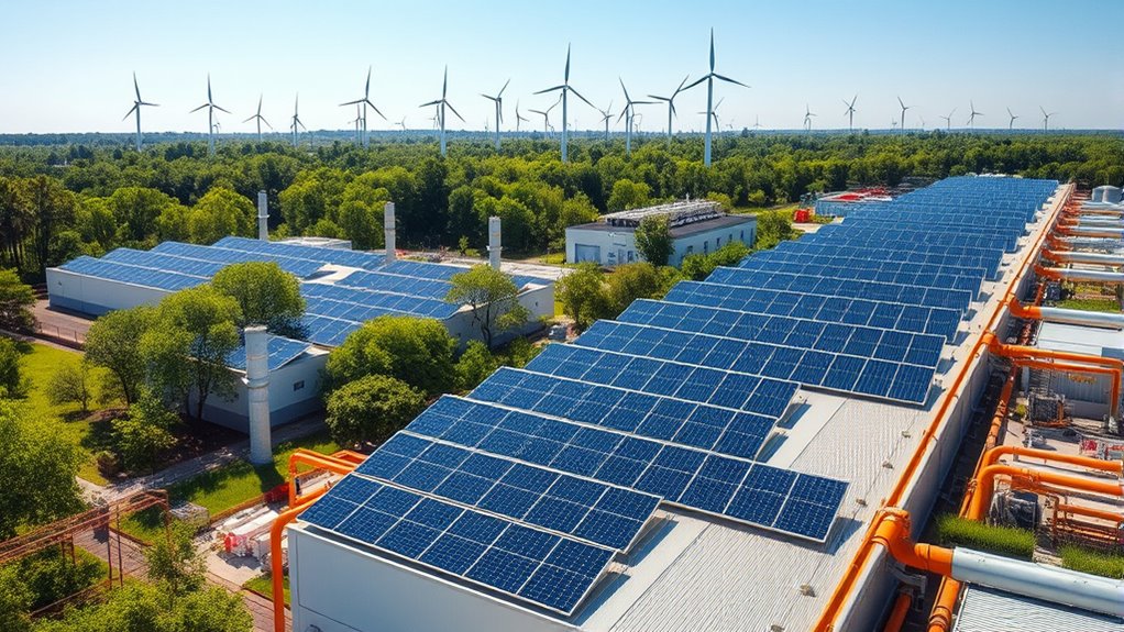 Green manufacturing focuses on boosting energy efficiency and achieving carbon neutrality by using eco-friendly methods, renewable energy, and smarter technology. You can help by supporting companies that adopt sustainable practices such as waste reduction, recycled materials, and clean energy sources. This approach not only benefits the environment but can also lower costs and improve product quality. Keep exploring to discover more ways green manufacturing influences your choices and benefits our planet.