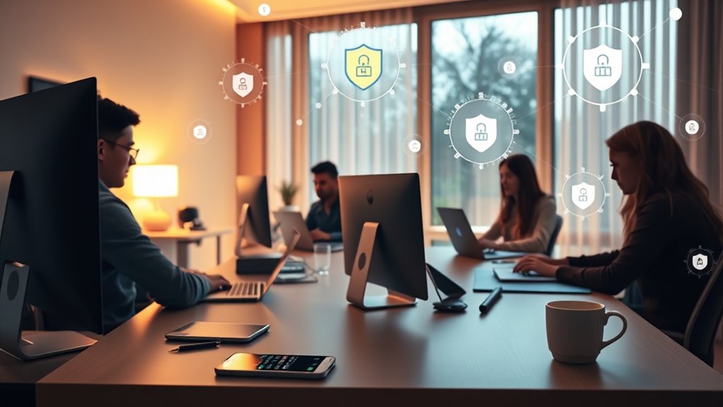 VPNs enhance your remote team security by encrypting your internet connection, making it difficult for hackers to intercept sensitive data. They mask your IP address, helping prevent tracking and unauthorized access. VPNs also allow you to securely access company resources from any location, reducing the risk of data breaches. By using VPNs, you guarantee that your team’s communications and information stay protected, even when working from public or unsecured networks.