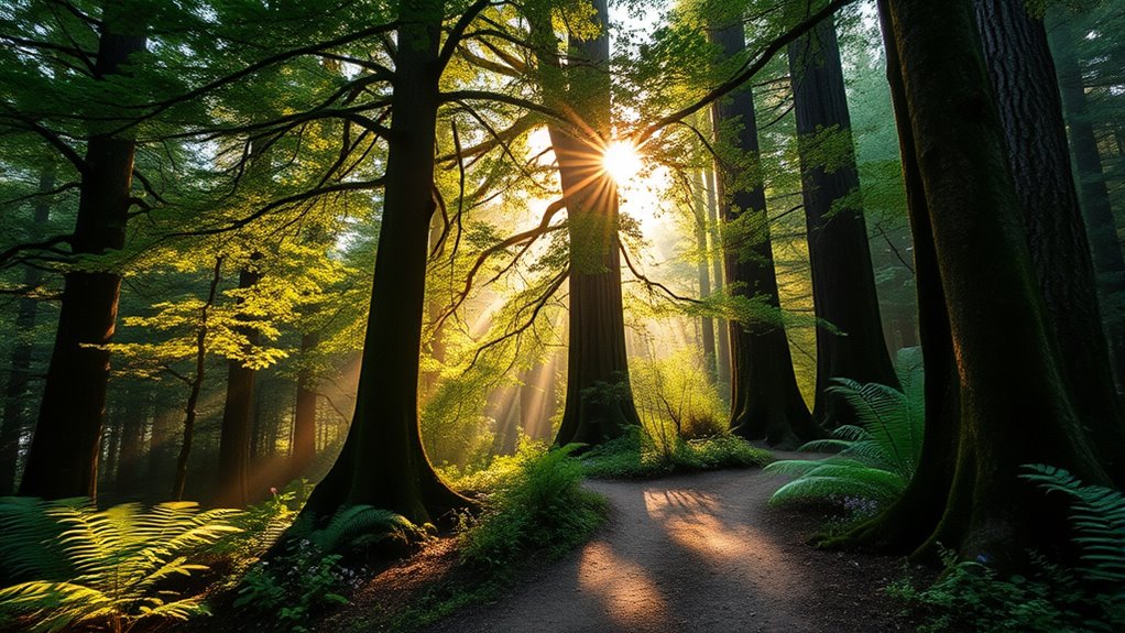 Forest bathing invites you to slow down and immerse yourself in nature’s calming atmosphere. By engaging your senses—smelling pine, feeling textured bark, listening to rustling leaves—you can reduce stress and mental clutter. Breathing in phytoncides from trees boosts your immune system and promotes calm. Regular practice enhances overall well-being and reconnects you with the natural world. If you keep exploring, you’ll discover how this simple practice can transform your health and happiness.