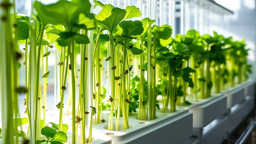 If you’re a beginner, you’d think choosing complex plants is the way to go, but simple is better. Start with lettuce, basil, or spinach—they grow fast and tolerate beginner mistakes. These plants thrive in hydroponic systems and give you quick, satisfying results. Don’t overcomplicate your first try; focus on easy wins. Once you master these, you’ll confidently grow more challenging plants, turning your home into a lush, soil-free garden.