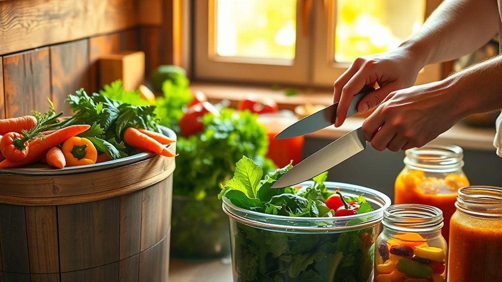 To reduce food waste in your kitchen, plan meals carefully and buy only what you need, supporting waste reduction. Use Airtight containers and organize your fridge to keep ingredients fresh longer. Get creative with leftovers, turning them into new meals, or freeze excess portions for later. Compost food scraps like vegetable peels, and choose imperfect produce. Adopting these sustainable practices can make a big impact—keep exploring to discover more simple ways to cook greener.