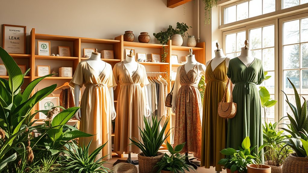 Choosing eco-friendly fashion means opting for sustainable materials like organic cotton, hemp, and recycled fabrics that require fewer chemicals and less water. Support ethical brands that prioritize fair labor practices and transparent supply chains, often producing locally to reduce emissions. Small steps like shopping secondhand or choosing timeless styles help lessen your environmental impact while promoting fair treatment for workers. Keep exploring to discover more simple ways to make your wardrobe both stylish and responsible.