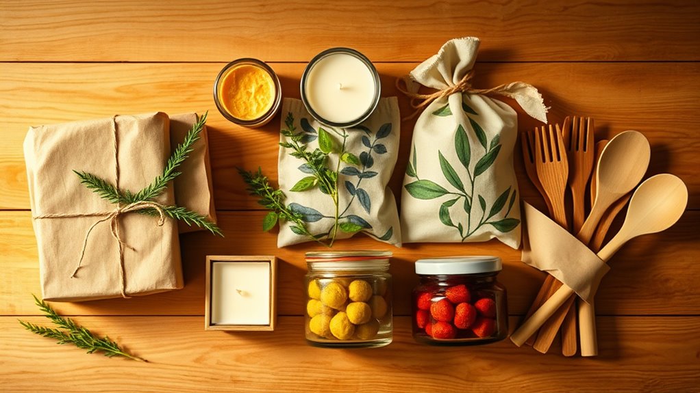 Looking for sustainable gift ideas for any occasion? You can choose eco-friendly products like reusable stainless steel bottles, bamboo utensils, beeswax wraps, and biodegradable coffee cups that help cut waste. Personal care items such as organic skincare, biodegradable razors, and natural soaps also make thoughtful gifts. Upcycled jewelry, recycled journals, and experiences like eco-tours or classes promote sustainability. Keep exploring these options to find perfect, greener presents your loved ones will appreciate.