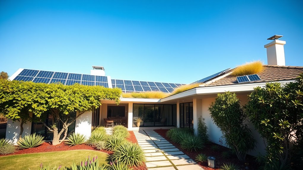 To design a sustainable home in 2025, focus on energy-efficient upgrades like modern insulation, double or triple-pane low-emissivity windows, and ENERGY STAR appliances. Conduct an energy audit first to identify key areas for improvement. Incorporate renewable energy sources such as solar panels and smart technology for enhanced control and efficiency. Combining these strategies helps reduce costs, lower your environmental impact, and increases comfort—continue exploring to discover how to implement these solutions effectively.