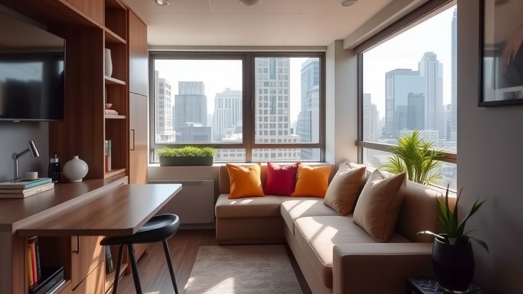 Living tiny is like fitting a whole universe into a cozy box—you gain freedom, simplicity, and a brighter outlook. Just ask Sarah, who downsized her apartment and found more time for passions and friends. Studies show that tiny home dwellers often report higher happiness and lower stress. So, embrace the challenge, design smartly, and discover that less truly is more. Your perfect city sanctuary awaits, one clever square foot at a time.