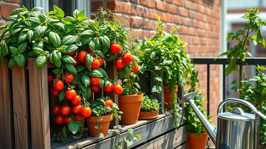 You should consider growing basil, mint, parsley, chives, and thyme on your small balcony. These herbs thrive in containers and don’t require much space, making them perfect for limited areas. Basil adds flavor to dishes, mint freshens drinks, and parsley boosts your meals. Chives and thyme are low-maintenance. With proper watering and sunlight, you’ll enjoy fresh herbs right at your fingertips, enhancing your cooking experience daily.