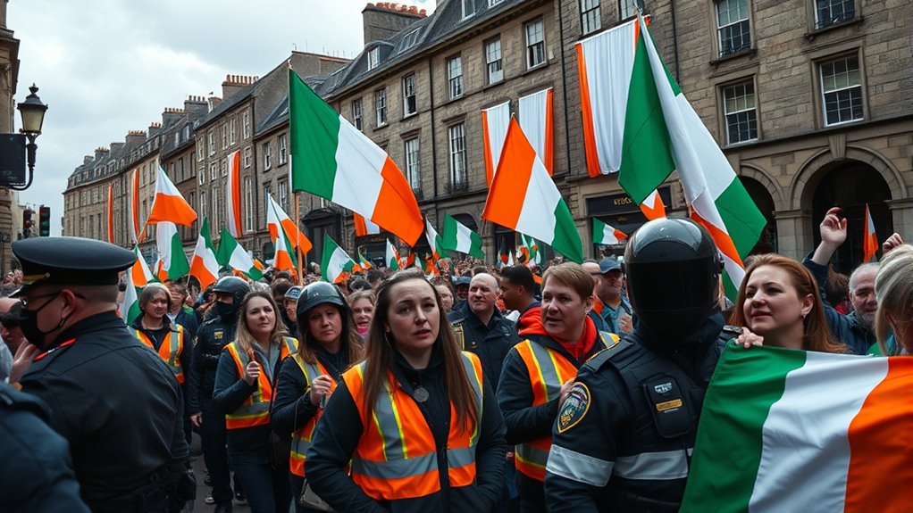 Like the guards at a border, protesters oppose policies that restrict immigrant rights, such as stricter visa regulations, deportation measures, and reduced access to social services. You might see them rally against laws they believe unfairly target newcomers or threaten community cohesion. These policies, they argue, undermine Ireland’s inclusive identity, pushing for reforms that promote integration and protect immigrant communities from discrimination and exclusion.