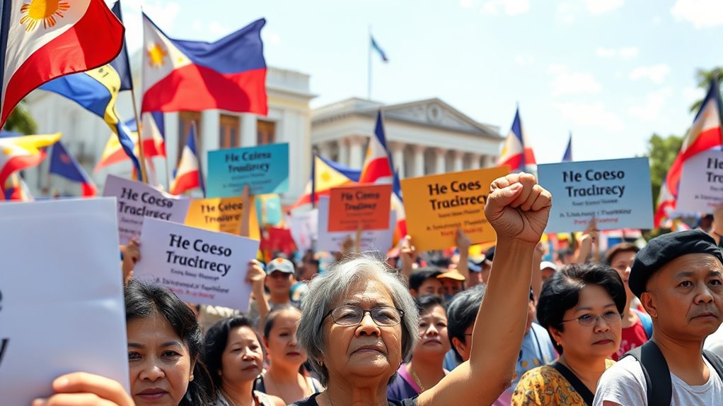 You see how widespread protests across the Philippines demand transparency and accountability from a government plagued by corruption. Citizens use streets, social media, and gatherings to voice their frustration over broken systems and unfulfilled promises. Their demonstrations highlight issues like bribery, nepotism, and shady contracts. These protests serve as a collective push for systemic reform and honest leadership, showing how unity can drive change. Keep exploring deeper, and you’ll learn more about how these voices are shaping the future.