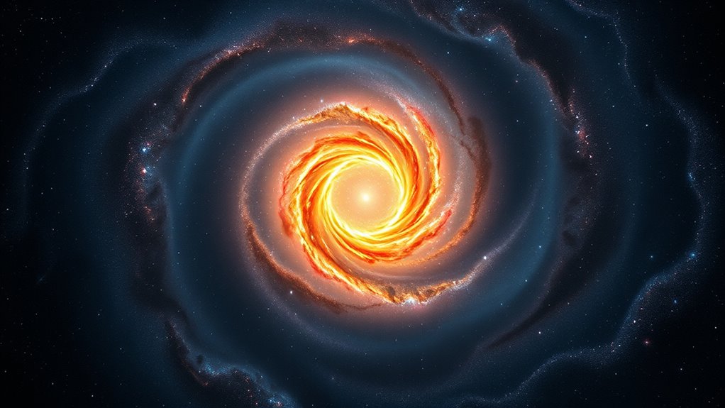 Hubble has captured a stunning glowing ring in a distant spiral galaxy, revealing a dramatic structure shaped by recent cosmic interactions. This fiery ring is made of bright, young stars and glowing gas, indicating active star formation caused by a gravitational disturbance, such as a collision or close encounter. The discovery offers clues about the galaxy’s past and its ongoing evolution. If you keep exploring, you’ll uncover even more about this fascinating cosmic feature.